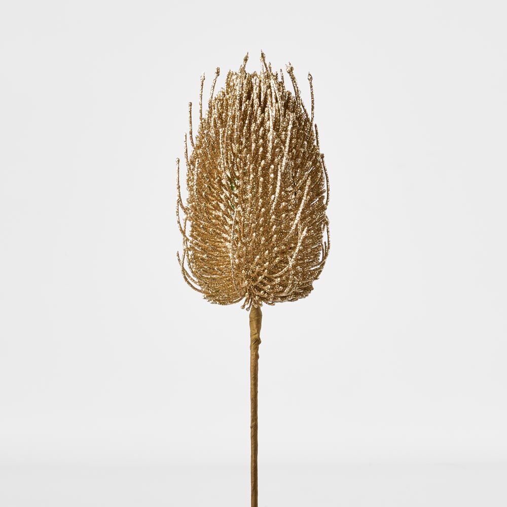 This unique Banksia Glitter Stem Gold 63cm will make the perfect addition to your festive displays. This piece is ideal to use as part of a tree topper. Stems are easy and versatile to use making them perfect to add to any garland or wreath, or to display in a vase.
