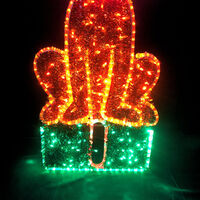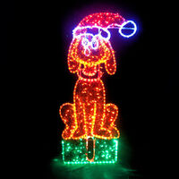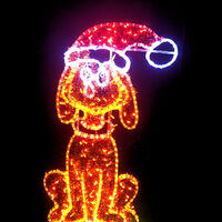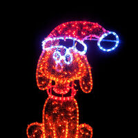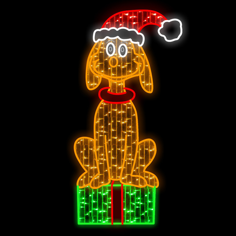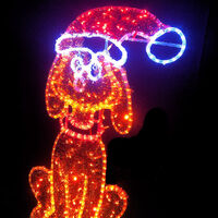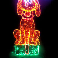 Dog Sitting on Present motif display is man's best friend and your Christmas display is not complete without him!. Size is 65cm wide x 130cm tall. Colours are Orange, Red, Green, Warm White and Cool White. Our motif comes fully assembled with swinging stand on back to enable motif to free stand (stand may require stabilising support). Made from a combination of Rope Light with 36 LEDs per metre and String Lights on an aluminium frame to resist signs of rust and age.