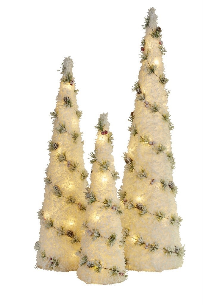 This gorgeous set of 3 snow covered cone Christmas trees are filled with LED lights. They are 100cm, 80cm, 60cm high and they are each run on a separate battery box taking 3 x AA batteries each (not included). Trees can be used individually or together, perfect for tabletop or standalone display.