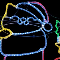 Rusty the Kitten in Wreath 100cm is 494m wide and 100cm tall. This motif is fully assembled ready to hang either indoors or outdoors. Made from Rope Light with 36 LEDs per metre and String Lights with coloured rubber cable on an iron frame construction with powder coating for durability and longevity. With a hook built into the frame, this motif is easy to hang. Includes 5m SAA Connectable Power Cord.